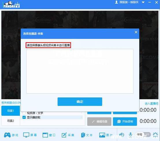 点击“采集”按钮,助手会提示你添加直播源,直播源可以是摄像头或者视频采集卡,主播可以自行选择进行直播。