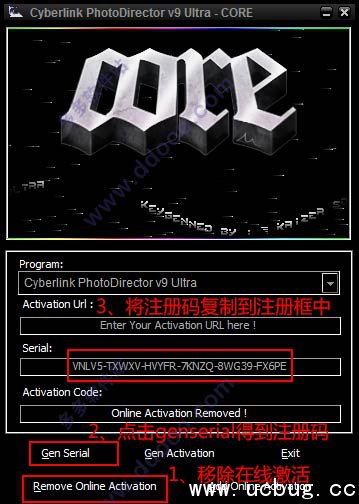 7、成功升级后,找到2.Fix文件夹下的注册机,移除在线激活,点击genserial得到注册码,再将注册码复制到软件注册框中;