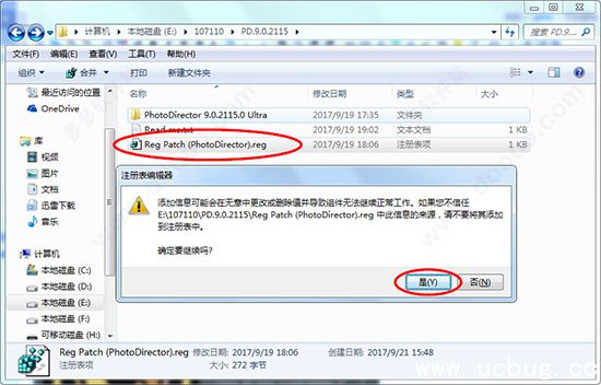 6、然后返回安装包,运行相片大师9精简补丁“Reg Patch (PhotoDirector).reg”,选择“是”载入许可信息