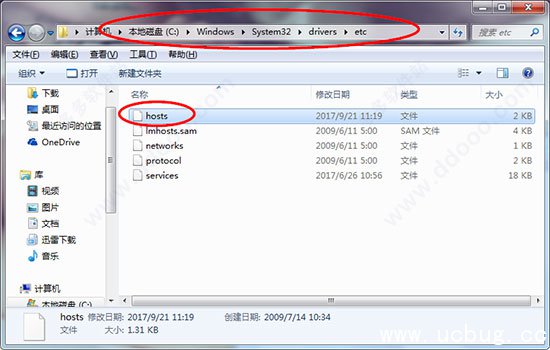 4、打开C:\Windows\System32\drivers\etc,找到文件“hosts”,右键点击“以记事本方式打开”