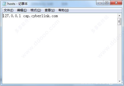 5、在其中添加“127.0.0.1 cap.cyberlink.com”屏蔽联网(注意:一定要记得保存,如果保存不了右键点击文件取消“只读”后进行修改)