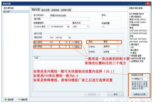 设置屏参密码『888』,在屏参设置界面中,根据需要设置好以下几点“控制卡型号、颜色类型、屏宽、屏高、通讯方式”。