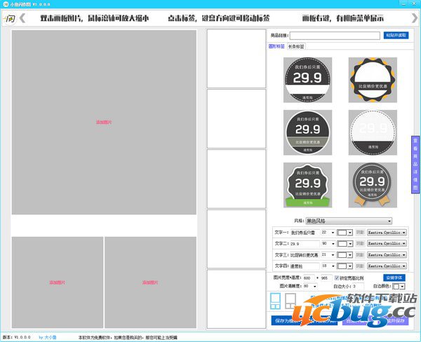 小鱼闪作图是一款招商淘客作图软件,能够急速闪电作图,本软件仅不到3M大小,用了易语言自带的画板写的,完全的所见即所得,作图的时候,会有锯齿感,但合成后是没有的!