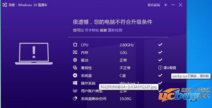 Win10 直通车上线后,发现部分用户在使用中出现在检测时候提示 peckp.sys这个驱动不兼容问题,如下图: