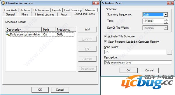 此选项卡允许用户配置ClamWin在特定时间运行扫描。 计划扫描的详细信息显示。 要添加扫描,请单击添加按钮,然后设置要扫描的描述、频率、时间和文件夹。