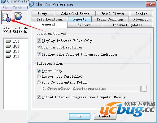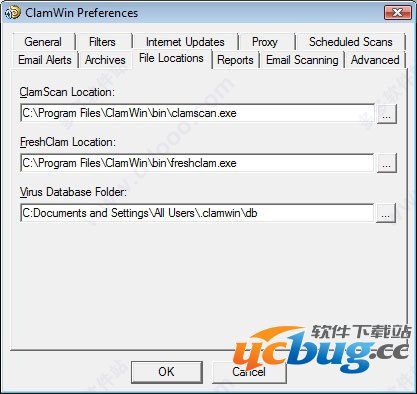此选项卡允许ClamScan程序文件,FreshClam程序文件(用于检索数据库更新的程序)和病毒库的位置被更改。