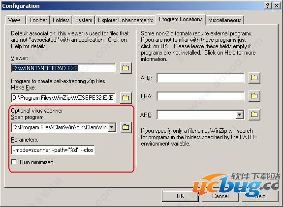 5、同时你也可以在WinZip压缩软件中使用ClamWin来扫描病毒,你需要打开WinZip并进入选项配置菜单,然后点击程序位置选项卡,然后指定下列参数: