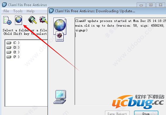 2、最好在查杀时候,更新下病毒库,当然你每次启动clamwin时候都会自动更新。