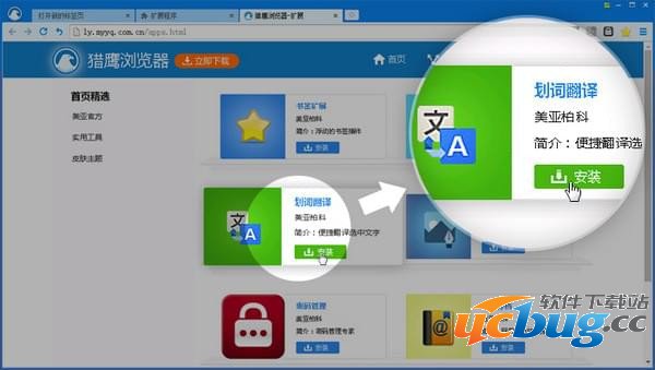 3、页面将跳转到猎鹰浏览器扩展下载界面,选择要下载的扩展插件,点击安装。(将以划词翻译为例介绍)。