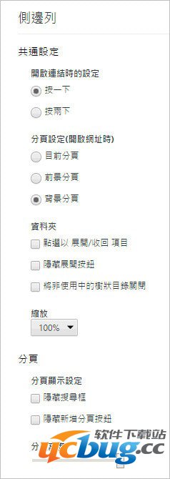 从设定当中可以马上看到这款浏览器的特色在哪里,分页功能、侧边列、超级拖曳、滑鼠手势、自订快捷键等等,都是非常实用的功能。