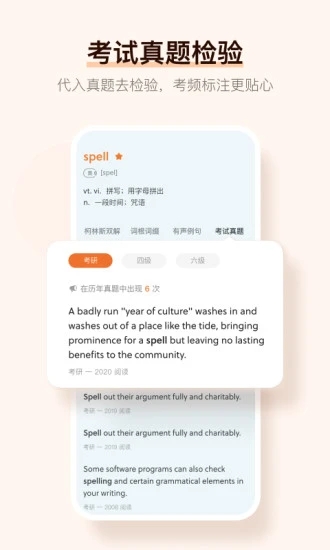 专为英语考试定制的一站式解决方案。在海量有声例句创造的真实语境中,用强大的学习理念串联,高效呈现词义和用法,同时借助智能记忆算法,真正科学高效地掌握单词。