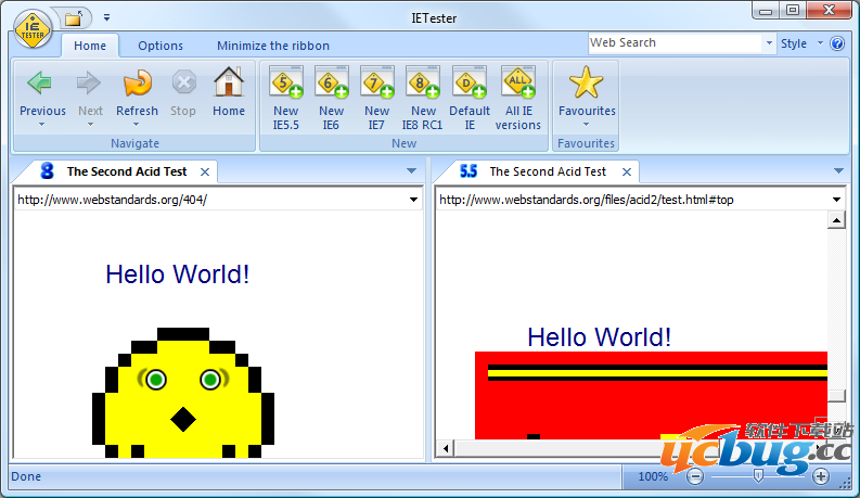 通过 IETester ,设计者们可以在一个窗口下轻松地打开支持不同版本IE的标签页,这里有一个细节:标签前面的蓝色数字则代表了所属IE的版本号。虽然数字的样式有点“丑”,但是便于使用者识别IE的版本号,为用户提供了方便。