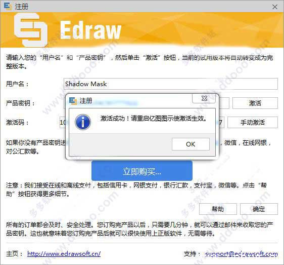 9、然后复制注册机“Activation Code”框中的激活码,粘贴后点击激活,至此edraw max 9.2中文精简版完美激活。