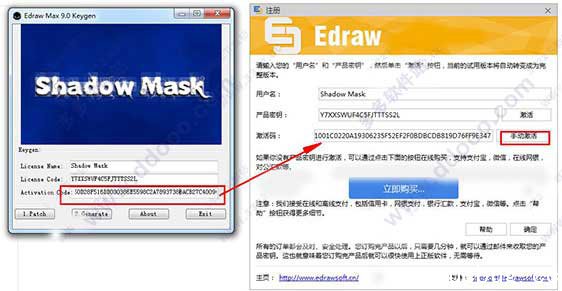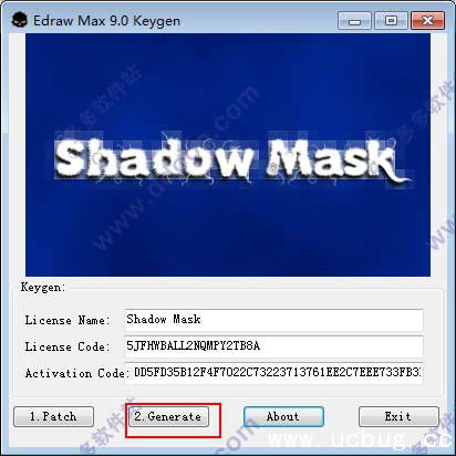 6、这里打开软件包中注册机 EdrawMax 9.0_Keygen[Shadow Mask].exe,点击界面“2.Generate”按钮,这时候会算出适用您计算机的用户名|注册码|激活码。(注:请千万不要点击“1.Patch”按钮)