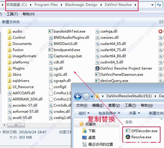 7、接下来对达芬奇15进行精简,将软件包中的文件“Resolve.exe和DPDecoder.exe”复制到软件安装目录对应位置替换精简即可;默认安装目录见前面的第5步,直接复制到这里覆盖即可;