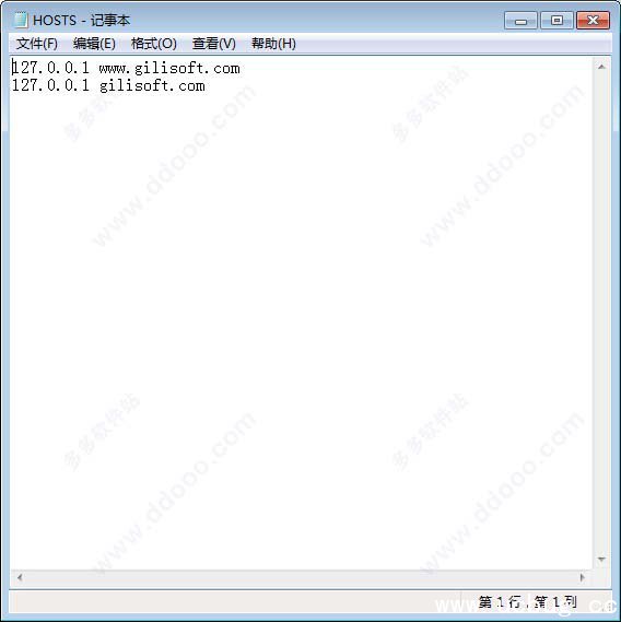 6、打开C:\Windows\System32\Drivers\etc的hosts文件,将127.0.0.1 www.gilisoft.com127.0.0.1 gilisoft.com复制到里面并保存。