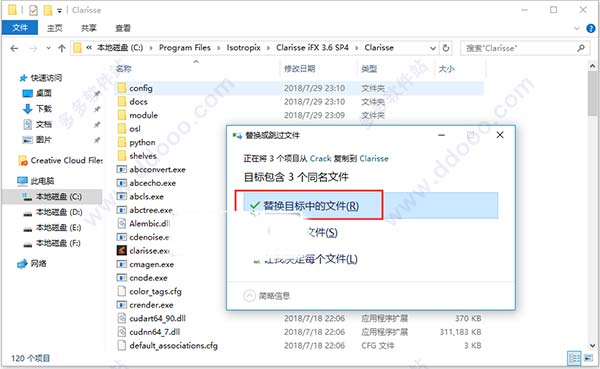 4、软件安装完成后,打开下载的软件安装包文件夹“AMPED”,将其中的精简补丁文件【clarisse.exe/cnode.exe/crender.exe】复制到安装目录下覆盖源文件;