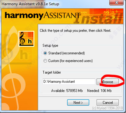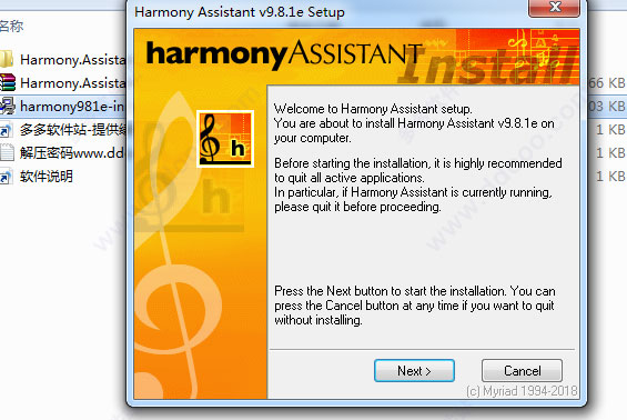 1、解压缩安装包得到harmony981e-install.exe安装程序和harmony.assistant.9.8.1e-MPT.exe精简补丁后,双击harmony981e-install.exe运行,点击next。