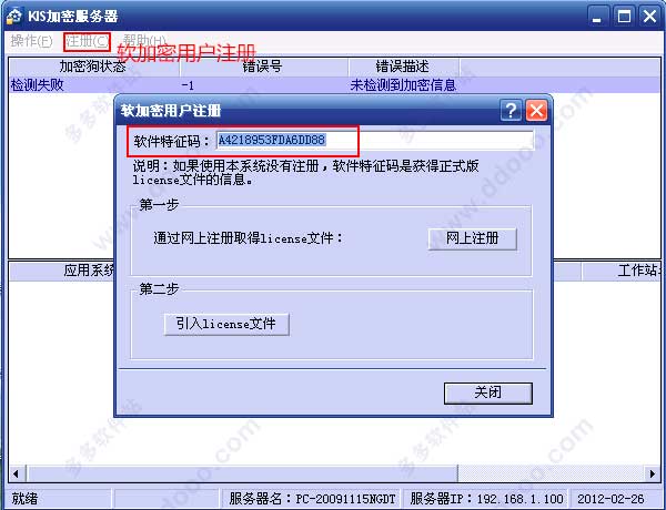 5、重启计算机后,接下来对软件进行精简,启动加密服务器--选择注册--软加密用户注册--软件特征码复制到注册机中;
