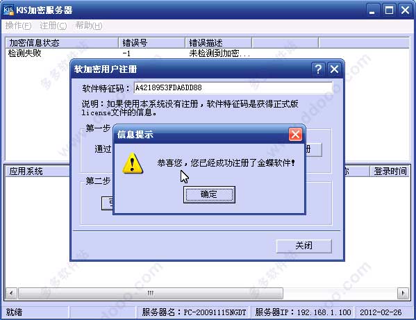 8、再次启动加密服务器(开始--所有程序--金蝶KIS专业版--工具--加密服务器),引入注册文件即可;