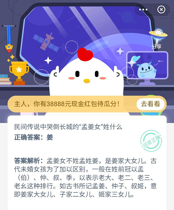 孟姜女哭长城这个故事真的非常经典,也是一个家喻户晓的角色人物,在今天的小鸡答题中,题目就是“民间传说中哭倒长城的孟姜女姓什么”,到底是姓姜还是姓孟,赶紧一起来看看正确答案是什么吧。