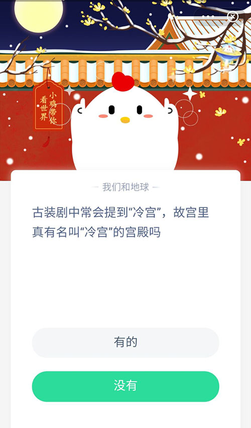 相信大家都看过一些古装剧,那么在古装剧中常会提到冷宫,故宫里真有名叫冷宫的宫殿吗?今天的支付宝小鸡答题中的问题就是这个,赶紧快和小编一起来看看正确答案吧,答对就能获取属于自己的小鸡饲料哦。