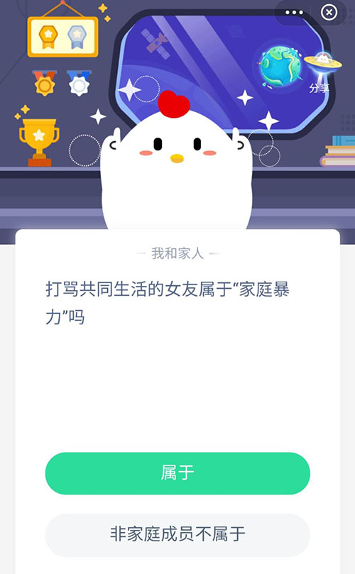 相信有超多小伙伴对于家暴这个词并不陌生,就在今天的支付宝小鸡答题中,就会给各位用户科普一下关于家暴的常识,打骂共同生活的女友算家暴吗?不知道小伙伴能不能顺利的回答正确呢,下面一起来看看正确答案吧。