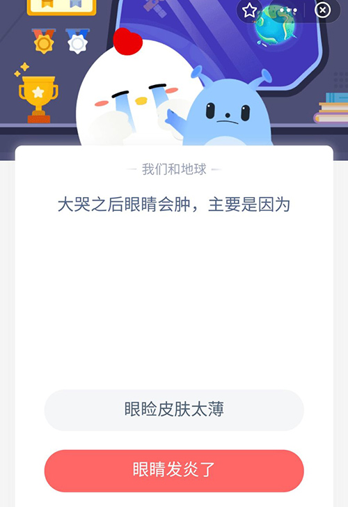 相信小伙伴们都有在大哭之后眼睛会肿的情况,这种情况主要是因为什么?在今天的支付宝蚂蚁庄园中,大哭之后眼睛会肿的情况,主要原因是因为什么?想知道蚂蚁庄园11月10日的正确答案吗,赶紧和小编一起来看看吧。
