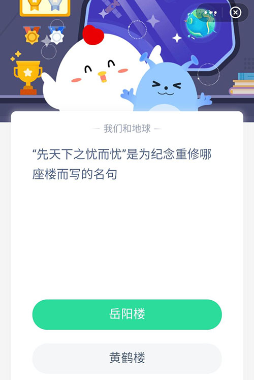 “先天下之忧而忧”这句话相信小伙伴们非常的熟悉,但是你指导这是为纪念重修哪座楼而写的名句?小伙伴们一定是学习过这篇文章,就在今天的支付宝蚂蚁庄园小鸡答题中,知道答案的小伙伴赶紧去领取自己的小鸡饲料吧。