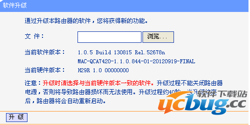 注意事项:1. 升级软件必须是与当前产品型号和硬件版本一致的软件。2. 升级过程中不能关闭路由器电源,否则可能导致路由器损坏。3. 升级时请使用有线方式连