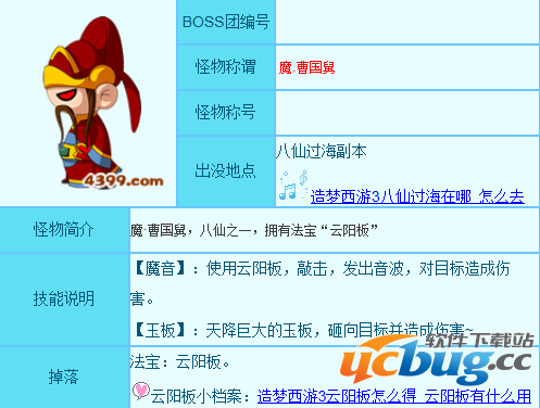 造梦西游3魔曹国舅技能造梦西游3魔曹国舅怎么打造梦西游3魔曹国舅BOSS团编号 怪物称谓 魔.曹国舅怪物称号 出没地点八仙过海副本造梦西游3八仙过海在哪怎么去怪物简介魔曹国舅,八仙之一,拥有法宝云阳板技能说明【魔音】:使用云阳板,敲击,发出音波,