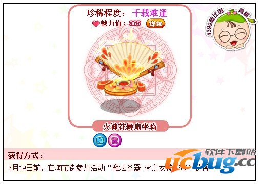 4399奥比岛火神花舞扇坐骑怎么得?奥比岛火神花舞扇坐骑在哪得?答:奥比岛火神花舞扇坐骑3月19日前,在淘宝街参加活动魔法圣器火之女神降临获得!
