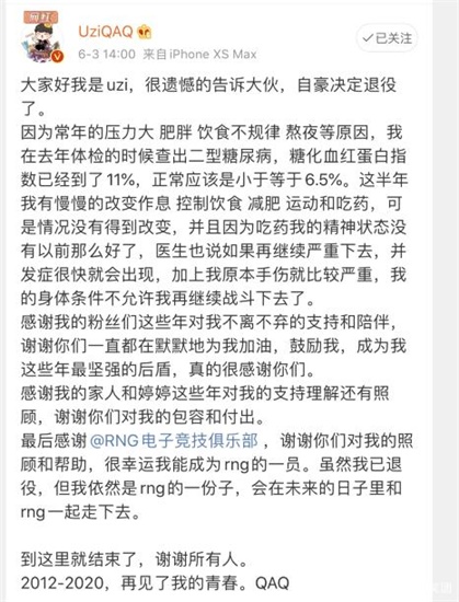2020年6月3日Uzi先是在官方微博宣布自己正式退役,跟着把推特的连接也给断开了,就在一众玩家小伙伴还在蒙圈的状态中时,Uzi本人也终于公开了自己是要决定退役了,相关的退役原因也在公开内容之中了,真的那些伴随着我们的青春已经不再了,还记得2013年他首站封神的时候吗?还有多次的lpl比赛的辉煌时刻,不过Uzi的退役原因真的让人泪目,小编做了整理。