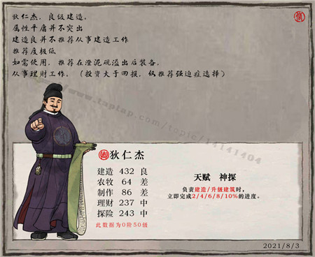 江南百景图狄仁杰值得培养吗?江南百景图是一款玩家们非常喜欢的模拟经营类游戏,这里可以解锁丰富的任务玩法,完成后可以获取丰富的奖励,而且这里还能自己建造建筑,在这里需要选择合适的角色进行游戏,这里的角色非常丰富,