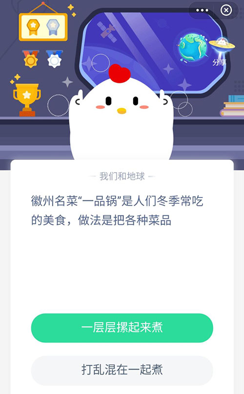 关于徽州名菜“一品锅”美食,小伙伴们了解是多少呢?今天的支付宝小鸡答题就是这个问题,小鸡宝宝考考你关于徽州名菜一品锅是把所有的菜那么制作,才能获得可口的美食呢,赶紧一起来看看正确答案吧。