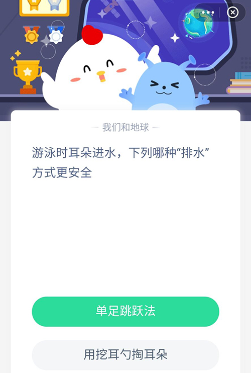 如果在游泳的时候耳朵不小心进水了,下面哪一种方法排水最安全,今天的支付宝小鸡答题中,关于游泳时耳朵进水的正确排水方法,小伙伴们知道那种排水方式是最安全的吗?赶紧和小编一起看看正确答案吧。