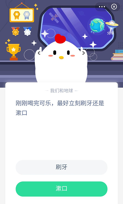 今天的支付宝小鸡答题中,向大家提出的问题:刚刚喝完可乐,最好立刻刷牙还是漱口?小鸡宝宝考考你,可乐是属于酸性食物,喝完可乐之后应该刷牙还是应该漱口呢?下面就和小编一起看看正确答案吧。