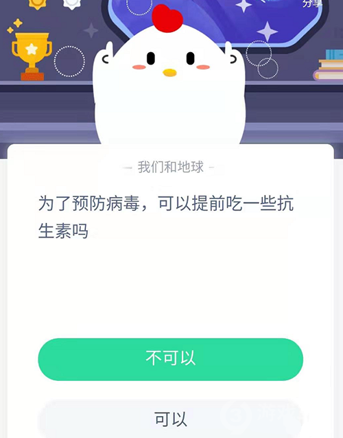 随着病毒的危害,大众们的防范意识也在增强,为了预防病毒,有些小伙伴选择提前吃一些抗生素来抵御病毒,但是真的可以提前吃一些抗生素吗?今天支付宝小鸡答题中出现的问题,赶紧一起来看看正确答案是什么吧。