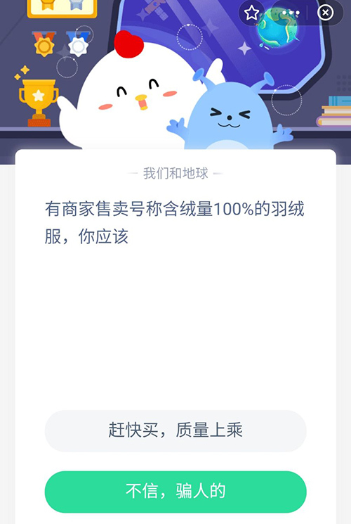 在购买羽绒服的时候,经常有商家售卖号称含绒量100%的羽绒服,这个时候你应该是信还是不信?在今天的支付宝蚂蚁庄园中,关于百分百羽绒服是真的假的,赶紧和小编一起来看看11月6日的正确答案吧。