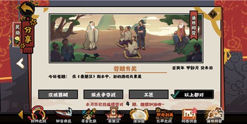 无悔华夏中有着一个渔樵问答的玩法,玩家在进行这一玩法时就需要回答正确的问题,而不少玩家不知道秦楚汉新游戏元素是什么,所以下面就带来了无悔华夏秦楚汉新游戏元素介绍了,那么一起来看看吧。