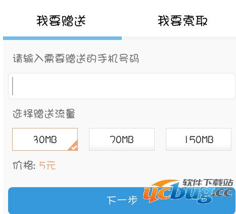 6、进入后,有“我要赠送和我要索取”两个选择。选择“我也赠送”,也就是你要送给别人流量包。填入,你送的人的手机号码,选择流量包数额。点“下一步”。就完成了。你的朋友马上就会收到你送的流量。费用是从你的手机话费扣除。