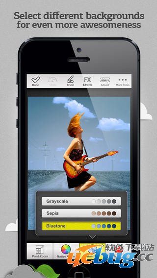 在裁剪需要部分后,会出现黑白化处理的照片,用户可以使用一个手指在其上滑动,让黑白的部分还原出它本来的色彩。软件带有3种滤镜效果供大家选择,还有着调节对比度、白平衡、图层等功能。
