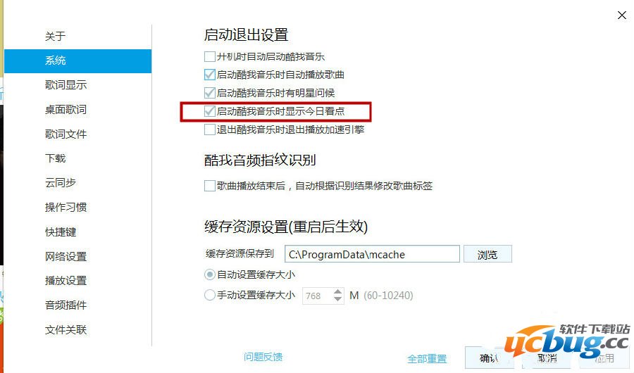 3、系统设置界面,启动退出设置下找到“启动酷我音乐时显示今日看点”取消勾选“启动酷我音乐时显示今日看点”,然后点击“应用”==“确定”