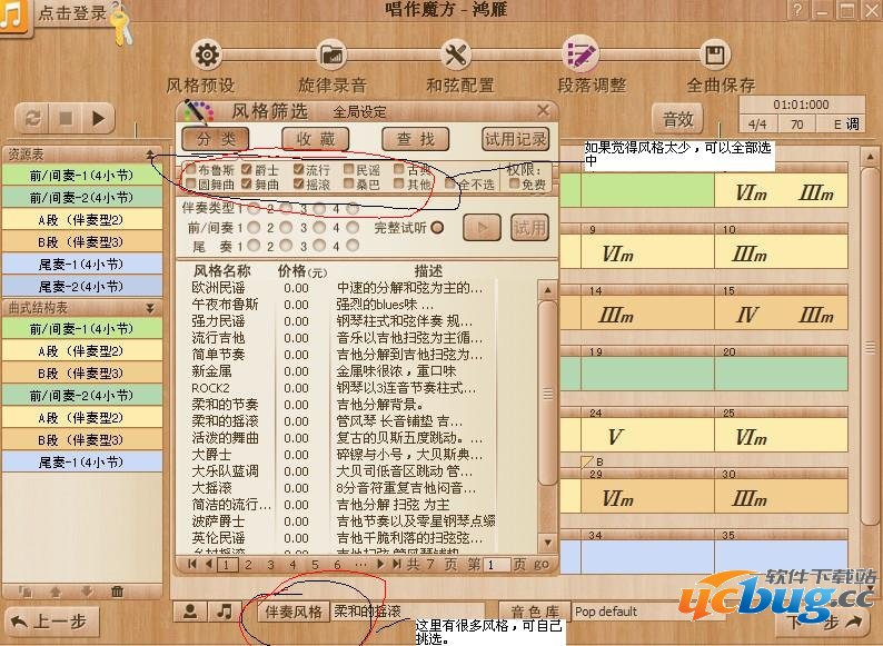 C.风格选择。经常听到有用户说风格太少的问题。就这个问题,大家可能没有勾上风格选择框里的分类。(另外44拍的风格最多。其他拍的风格较少,如果你在录音的时候就选的43 或者86拍,那么不好意思,确实风格比较少。)