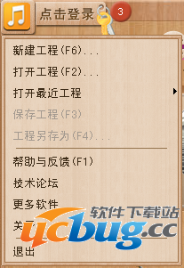 2、“开始”按钮,点击之后出现如图所示下拉菜单,用户可以通过选择菜单项进行诸如打开工程、保存工程、查询软件帮助以及访问官网论坛等操作。