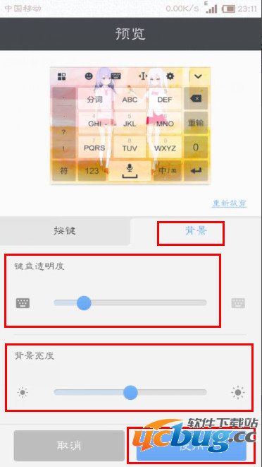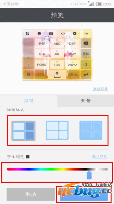 3、选择好自己想要设置为皮肤的图片,然后我们可以调整一下按键中的字体颜色和按键样式,调整一下背景选择自己想要的透明度以及背景的亮度
