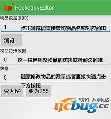 点击编辑物品我们能看到界面中出现你所持物品的信息,包括数量,伤害和物品的编号ID,我们随便点进一个方块试试!
