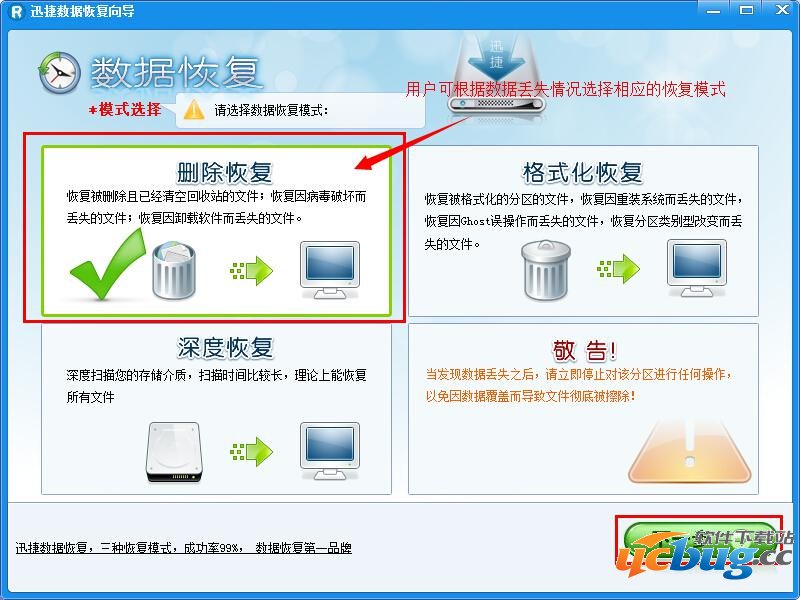 2、单击选择数据恢复模式“删除恢复”,然后单击“下一步”。