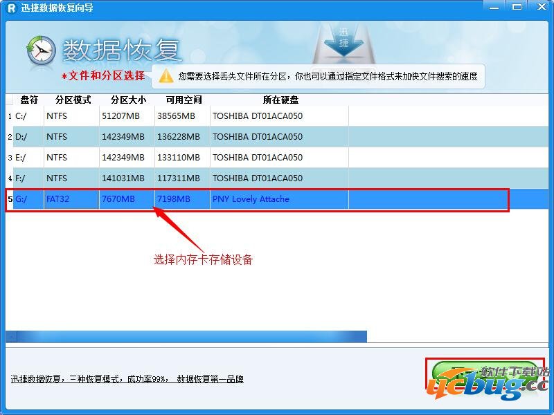 3、选择丢失的文件所在的分区,即丢失数据的内存卡,然后单击“下一步”进行扫描。