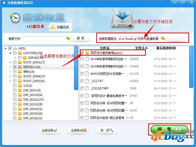 5、扫描完毕,在文件列表和文件夹中查找丢失的文件。被删除的文件有可能会被windows系统打乱目录,所以建议用户使用“搜索文件”功能查找文件,以节省时间。用户还可以对图片文件进行预览,以确认是否为所需要恢复的文件。找到并勾选需要恢复的文件,然后选择文件将要保存的路径,最后单击“恢复”按钮进行数据恢复。